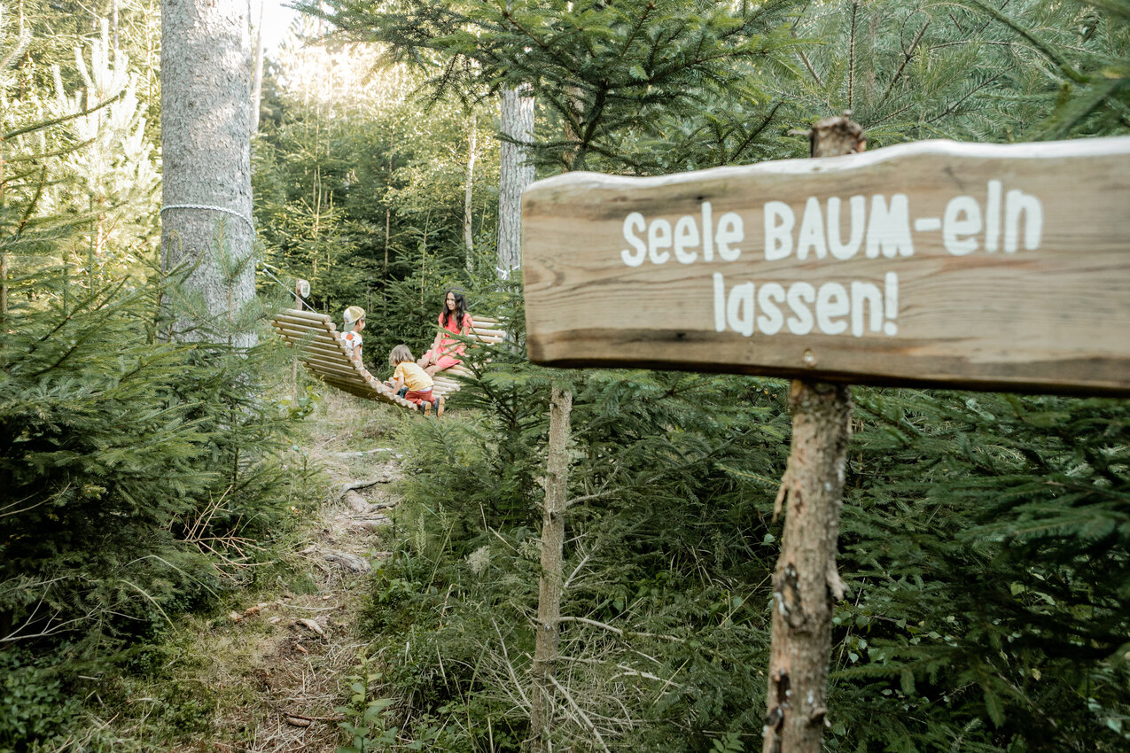 Das Klima des Waldes tut nicht nur unserer mentalen Gesundheit gut, sondern bildet auch die perfekte Basis für körperliche Entspannungstechniken wie Yoga. In Verbindung mit einer bildhaften Geschichte kann Entspannung wunderbar mit einer kindgerechten Massage verbunden werden. Alles, was man dafür benötigt, ist Fantasie und eine Begleitung, die die Massage auf dem Rücken vornimmt. Einfach auf den Baumstämmen Platz nehmen und genießen! Wer noch mehr Entspannung zwischen den Aktivitäten sucht, kann in Folge in der Hängematte baumeln und der Musik des Waldes lauschen.