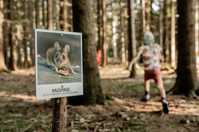 Wir haben erfahren, dass Bäume uns ähnlicher sind, als wir glauben. Doch wie sieht es mit den anderen Waldbewohnern aus? Zweifelsohne ist der Specht einer der aktivsten Klettervögel. Die Station „Waldhochhaus“ setzt sich detailliert mit der Thematik auseinander. Kindgerecht, interaktiv und hoch interessant, auch für uns Erwachsene. Welche fleißigen Waldbewohner ihr noch im Wald-Reich beobachten könnt, werdet ihr im Anschluss an die Waldolympiade sehen!  Mittlerweile nehmen wir das Totholz, welches hier gelegentlich am Wegesrand zu finden ist, genauer unter die Lupe. Die Kinder begutachten die Vielfalt an kleinen und großen Baumschwämmen und siehe da, wir werden sogar fündig, was essbare Pilze betrifft. Aus dem Moos heben sich eine Reihe eierdotterfarbener Pilze ab: Eierschwammerl! Sie zählen neben Beeren wie Heidelbeere, Brombeere und Walderdbeere zu den beliebtesten Waldfrüchten und sind zudem essentielle Kooperationspartner der Bäume.
