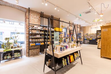 Wirf einen Blick in das SONNENTOR Geschäft - mit einem Klick ins Bild kannst du ganz einfach einen Rundgang machen: