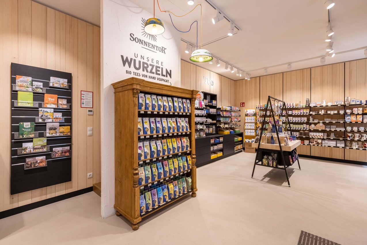 Präsentiert werden die Produkte in der einzigartig sinnlichen Atmosphäre, die die Marke SONNENTOR ausmacht: Genuss trifft auf bäuerliche Tradition und zeitgemäßes Design. Dabei sind die während der Renovierung freigelegten Ziegelsäulen ein echter Hingucker neben dem sich unsere biologischen Produkte besonders wohlfühlen.