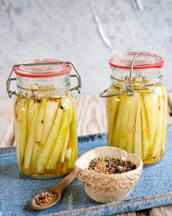 1. In jedes Glas 1-2 Teelöffel Einlegegewürz geben und den Sud heiß über das Gemüse geben, bis es abgedeckt ist.