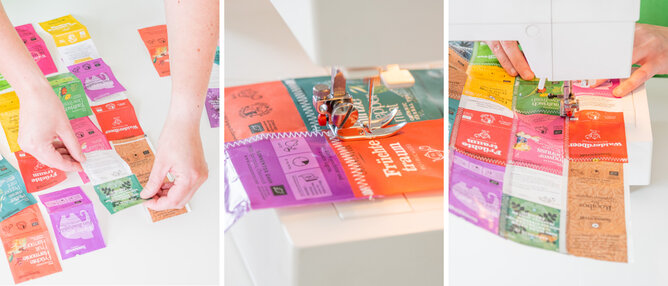 3. Nun die Teebeutel in Reihen zusammennähen und anschließend auch die einzelnen Reihen zusammennähen.