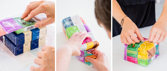 Teebeutelhüllen können ganz einfach zu einem kunterbunten Patchwork Geschenkpapier genäht werden. So ist nicht nur der Inhalt, sondern schon die Verpackung ein Hingucker.