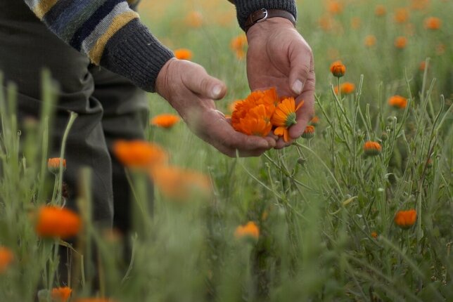 Auf dem Foto sind Ringelblumen zu sehen. Ein Mann hält eine Blüte in den Händen. | © SONNENTOR